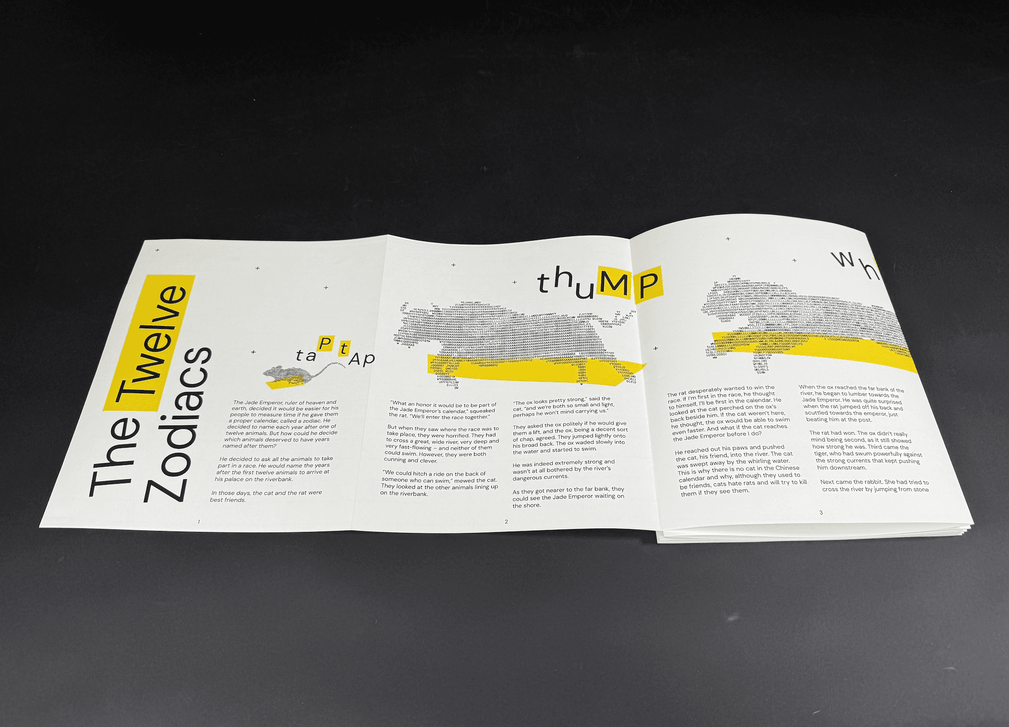 Although this traditional structure is no longer commonly used in mainland China, it remains significant in artistic and historical contexts. To balance tradition with readability, I chose to use Simplified Chinese characters instead of Traditional characters and a 12-page accordion fold to reinforce the sense of movement and progression involved within the race. English and Chinese texts each span six panels that meet at the center, symbolizing the convergence of the two languages.